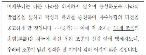 홍범을 통해 밑줄 친 ‘14개 조목’이 홍범 14조임을 알 수 있다. 제2차 갑오개혁 때 고종은 홍범 14조를 선포하여 적극적인 개혁을 추진하고자 하였다.